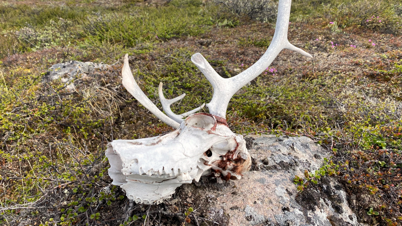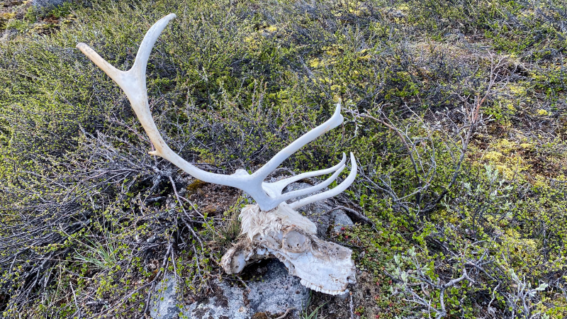 Auch liegen viele Geweihe und Rentierknochen auf den Wegen. Mit den Mücken hatten wir bis jetzt bis auf wenige Momente Glück. Der leichte Wind vertreibt die Biester. Gelegentlich nieselt es heute ein paar Tropfen, aber das Wetter hält sich. Nur kälter ist es geworden. Für die Mittagspause wird ein Platz am See gefunden und einige Seen weiter gibt es einen guten Campingplatz. Jetzt erstmal ins Wasser zum Waschen, Haare waschen und Baden bevor es zu kalt wird.