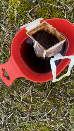 Zur Belohnung gibt es eine Kaffeepause vorm Aufbau. Es ist heute kälter geworden, aber noch trocken mit gelegentlichem Sonnenschein.