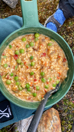 Seit einigen Tagen werden die Spiele rausgeholt und wir spielen UNO und es gibt einen Schnaps aus dem Flachmann. Nun noch Abendessen. Die Trockennahrung ist eigentlich ganz lecker. Heute gab es Gemüserisotto.