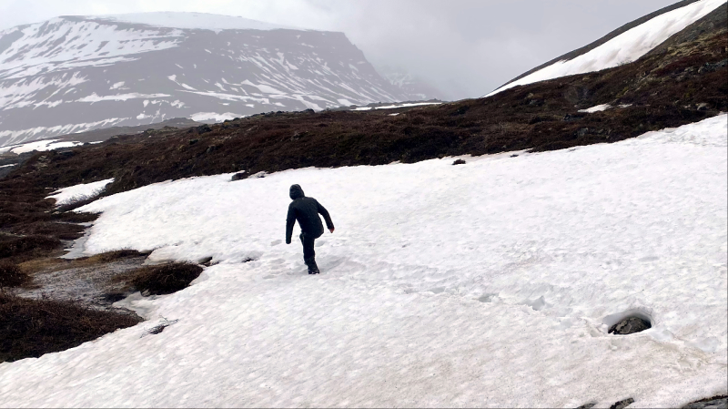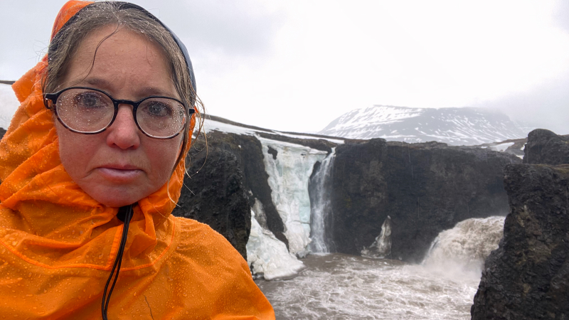 Weiter im strömenden Regen zum Wasserfall über Schneefelder und quatschigen Wiesen.