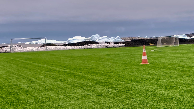 Jetzt kommen die Naturschönheiten an die Reihe: Schwarzer Lavastrand, grüner Fußballplatz – alles garniert mit Eisbergen.