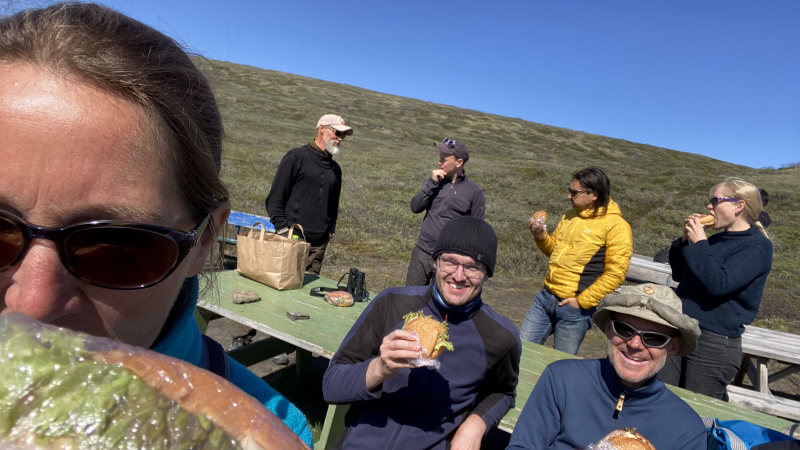 Da wird zugeschlagen. Ist schon etwas anderes als das Outdoor-Frühstück. Wir essen jetzt viel mehr als auf unserer Wanderung. Es bleibt noch Zeit, den gelben Wanderweg mit Blick auf die Eisberge zu absolvieren.