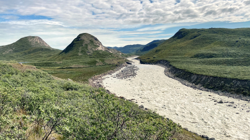 Mit leichter Verspätung machen wir uns auf den Weg. Die erste Schwierigkeit ist schon in Sicht – ein Geröllfeld. Das wird gut gemeistert, kostet aber Zeit. Anschließend führt der Weg am Ufer entlang. Nicht zu schwer und sehr schön. Wir haben das Gefühl gut voranzukommen. Bald wird es wieder matschig und beschwerlich. Zu denken gibt uns ein Gespräch mit Wanderern, die berichten, dass die letzte Etappe unpassierbar sein soll und im Tagesverlauf treffen wir einige, die deshalb abgebrochen haben und auf dem Rückweg sind. Das beschäftigt uns.