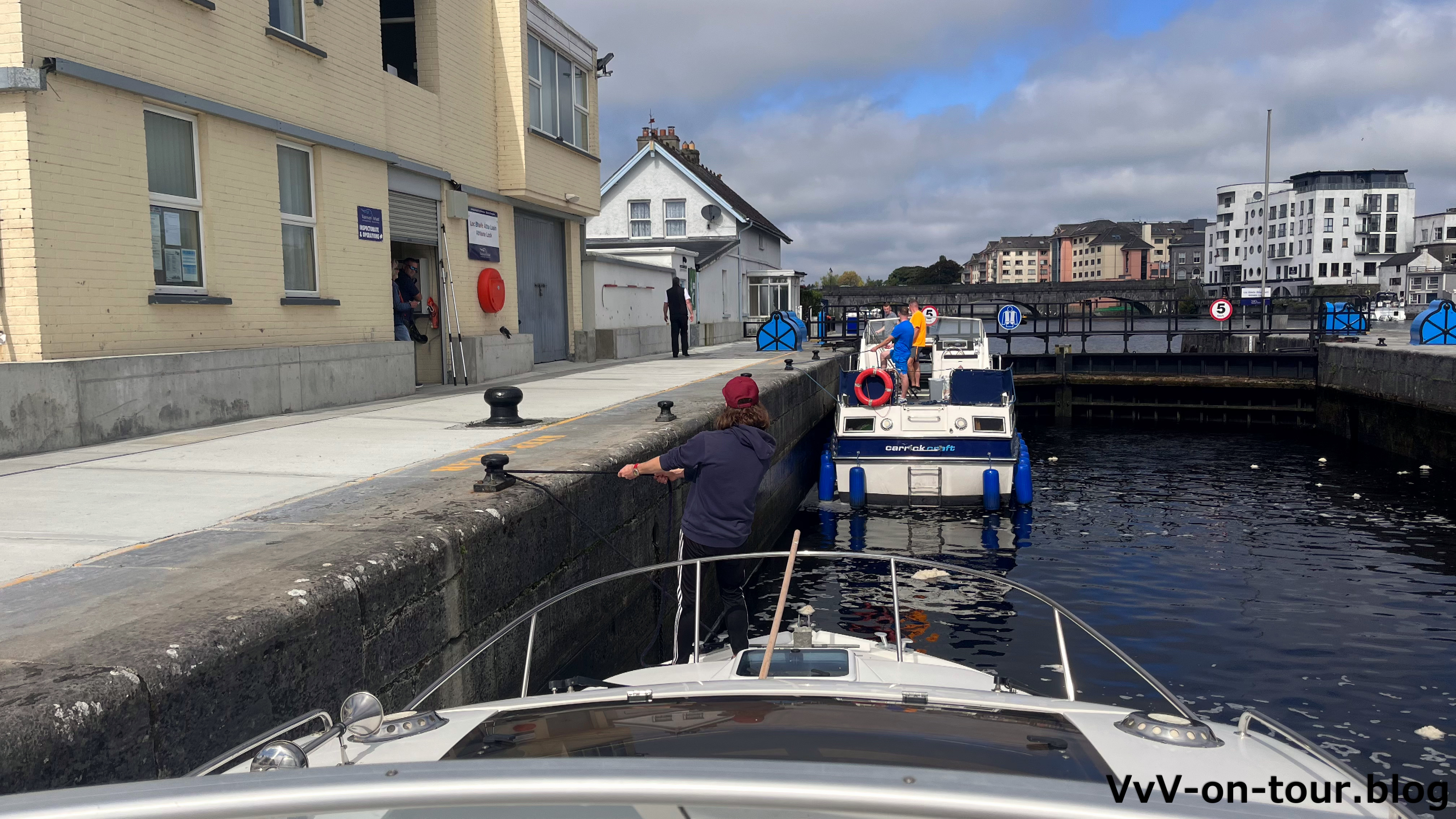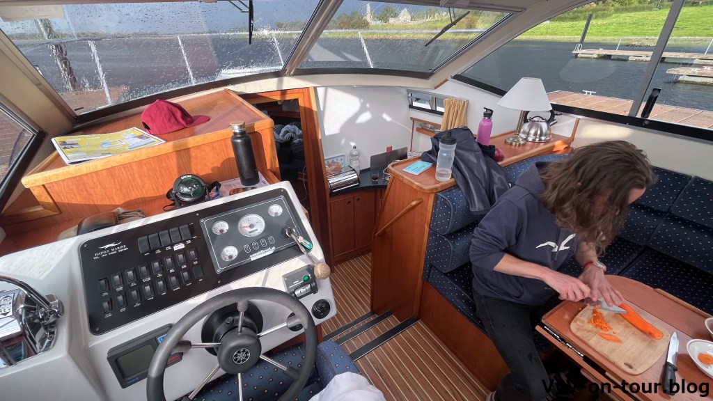 Nun zum Supermarkt zum Bevorraten mit den Basics, die man so zum Kochen braucht und für die Mahlzeiten und das Frühstück für die ersten Tage. So, alles aus dem Auto raus und auf das Schiff – inklusive des klatschnassen Zelts, damit es trocknen kann. Es ist sonnig und warm geworden. Wer hätte das heute Morgen gedacht. Die Reise geht los und es gibt die ersten Regentropfen. Das Regenzeug muss nur kurz getragen werden und das sonnige Wetter kommt zurück. Heute geht es bis Clonmacnoise – eine kurze Fahrt, um rechtzeitig dort zu sein bevor alle Liegeplätze belegt sind.