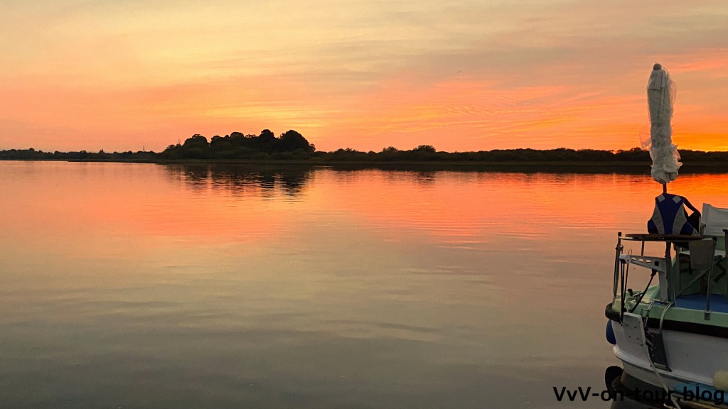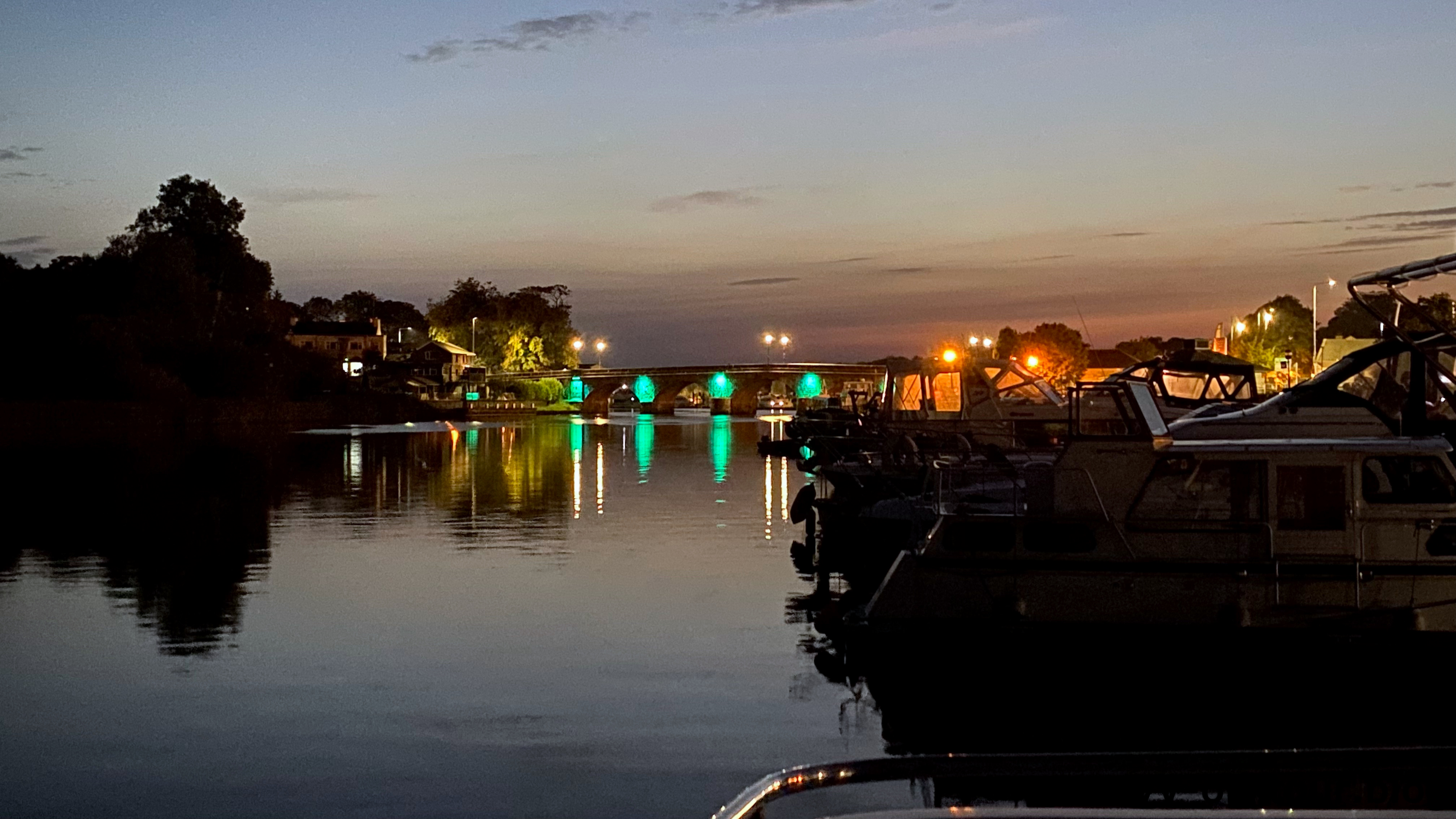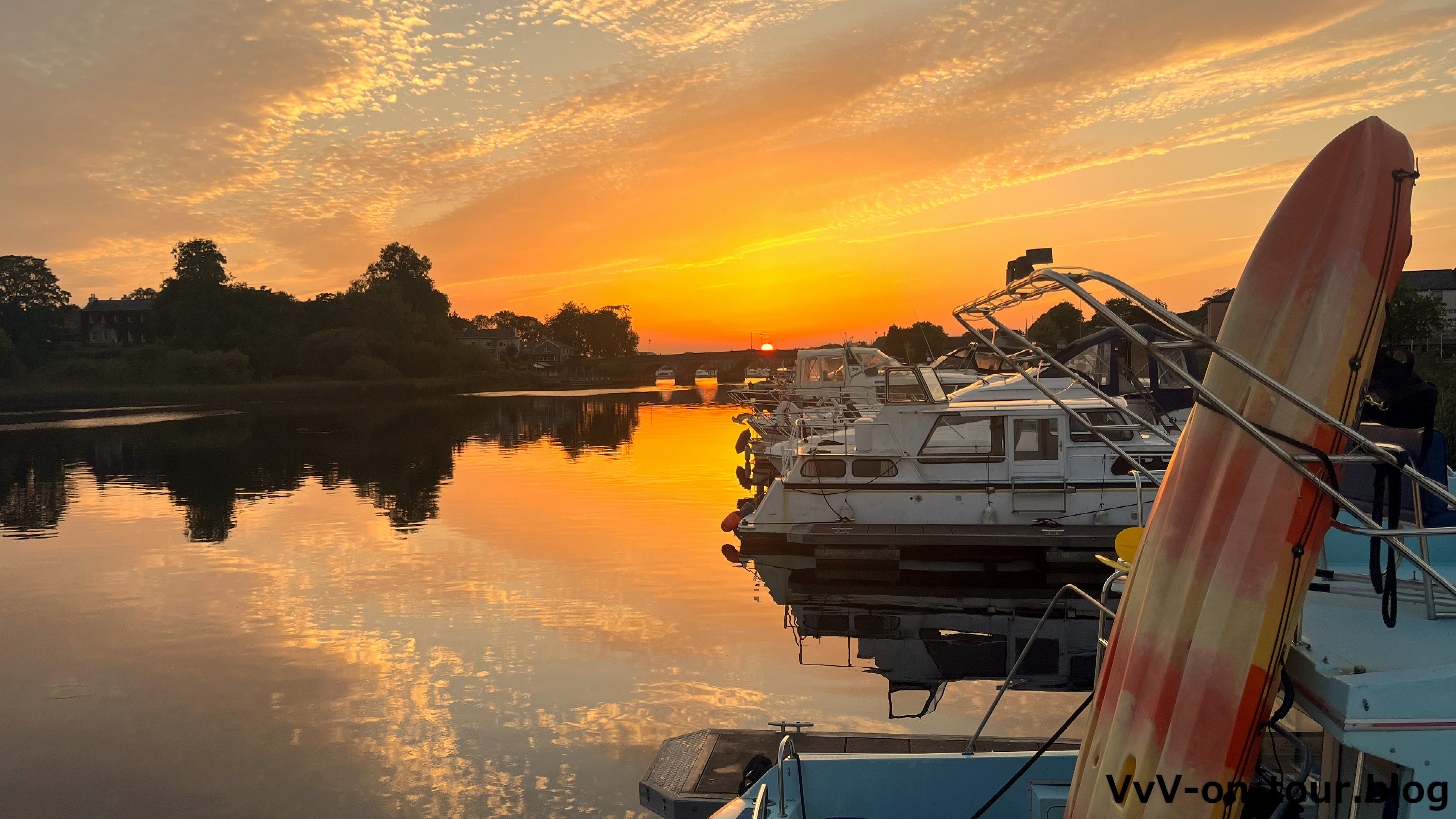 Weiter geht die Fahrt durch Brücken und Schleusen bis Carrick-on-Shannon, unser heutiges Ziel und auch das Ziel unserer Bootsfahrt, denn morgen treten wir die Rückfahrt an. Der Ort ist übersichtlich und lädt zu einem kleinen Spaziergang zur Kirche und in die kleine Einkaufsstraße ein. Später geht es nochmals zu LIDL, um die Vorräte zu ergänzen. Zum Abendbrot wird ein leckeres Curry gekocht. Die Sonne geht wieder in den schönsten Farben hinter der Brücke unter. Diese wird sogar stimmungsvoll beleuchtet. Es bleibt den ganzen Abend mild.