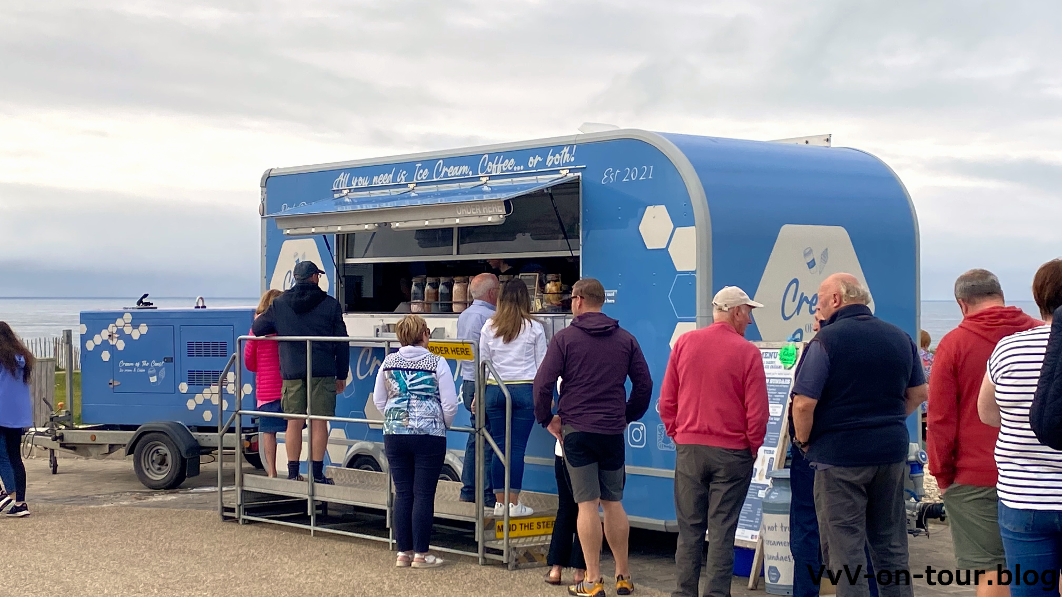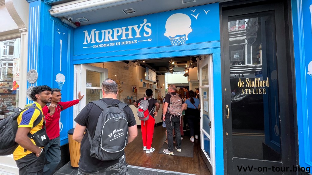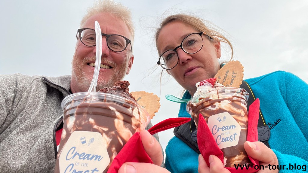 Den horrenden Eintritt (leider überall in GB so) schenken wir uns, dafür gönnen wir uns ein tolles Eis. Vor dem Eisstand auf dem Parkplatz hat sich eine große Schlange von „Eishungrigen“ gebildet. Wir können nicht widerstehen und schleißen uns der „Bewegung“ an. Es hat sich gelohnt.