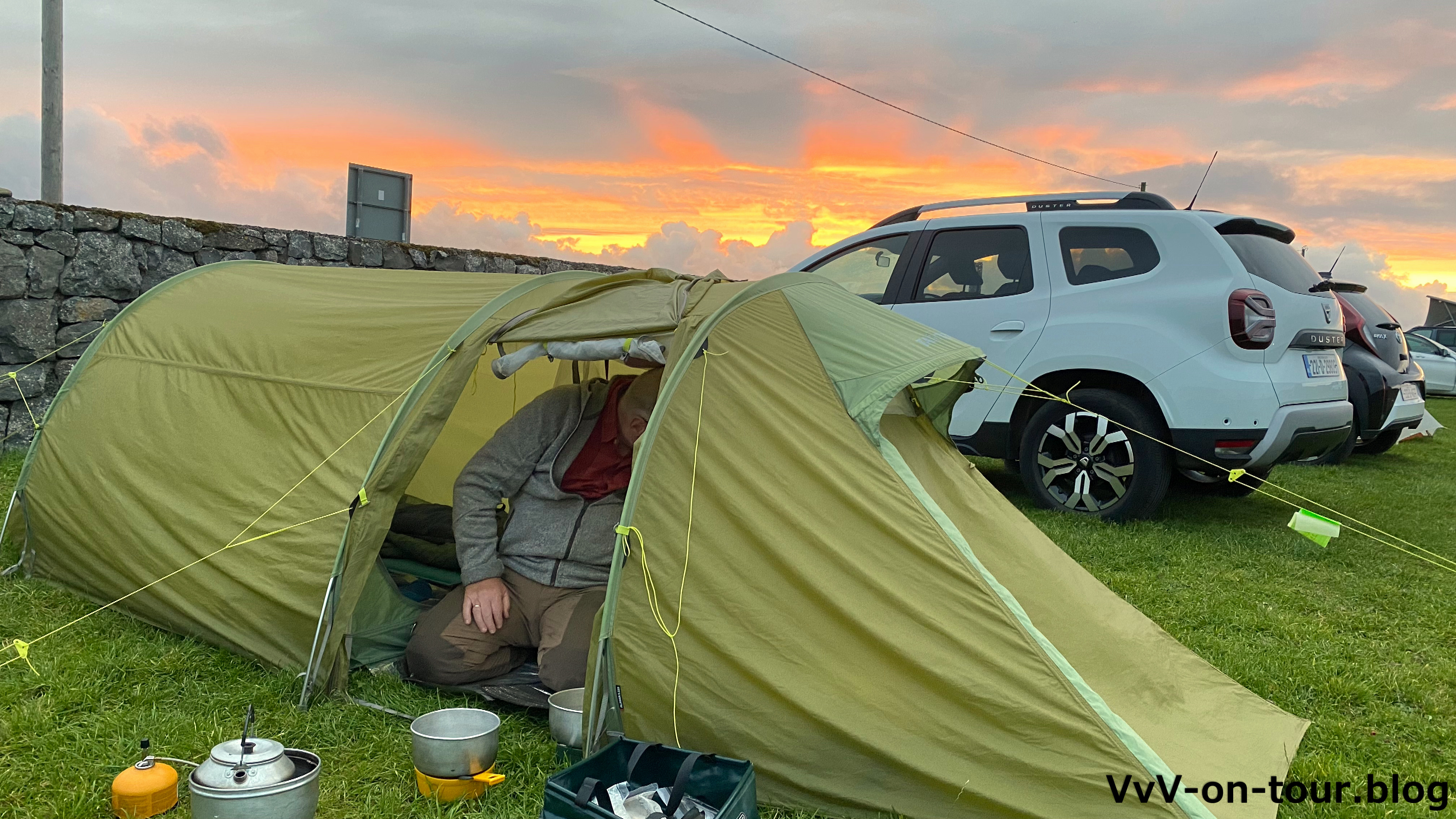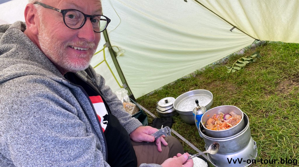 Das Wetter ist nicht so schlecht. Hier bekommen wir auch die passende Gaskartusche. Ansonsten ist der Campingshop sehr spartanisch. Campingläden sind in Irland nicht so angesagt. Abendessen gibt es im Zelt. Es sind die letzten zwei Packungen von Elisabeths Grönland-Trip.