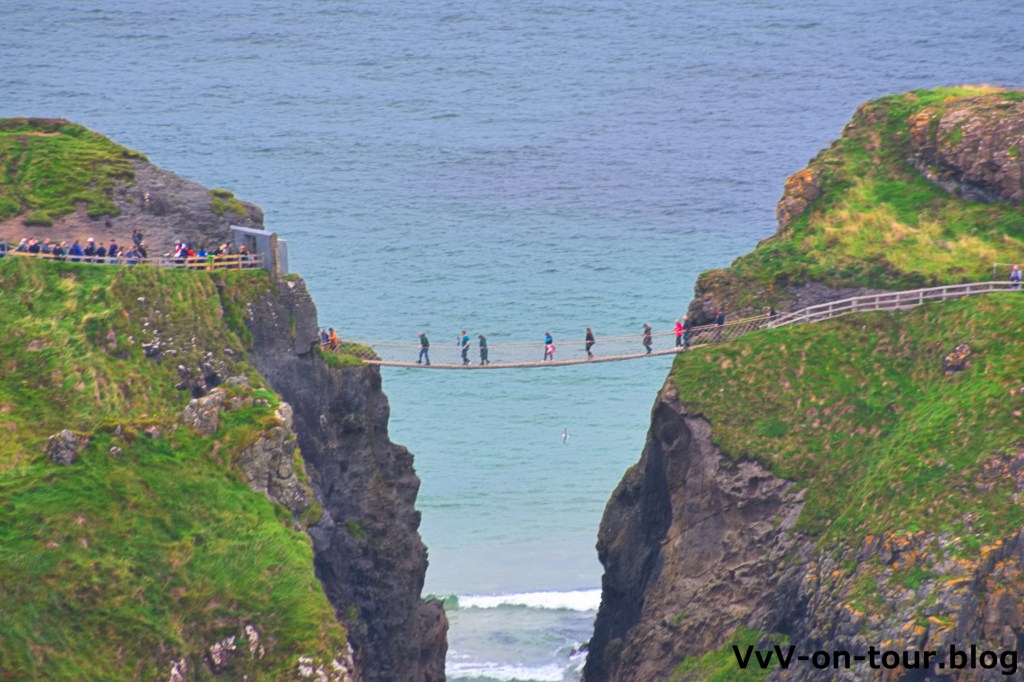 Auf der Weiterfahrt entlang der Küste Richtung Belfast gibt es immer wieder Aussichtspunkte mit Blick auf die Küste, auch auf die Carrick-a-rede Rope Bridge. Das Abenteuer, die 20 m auf dieser atemberaubenden Hängebrücke zu gehen, soll jedoch 20 £ kosten – das sparen wir uns.