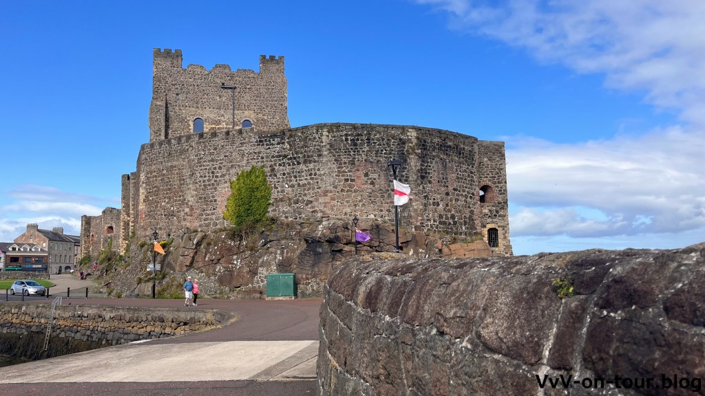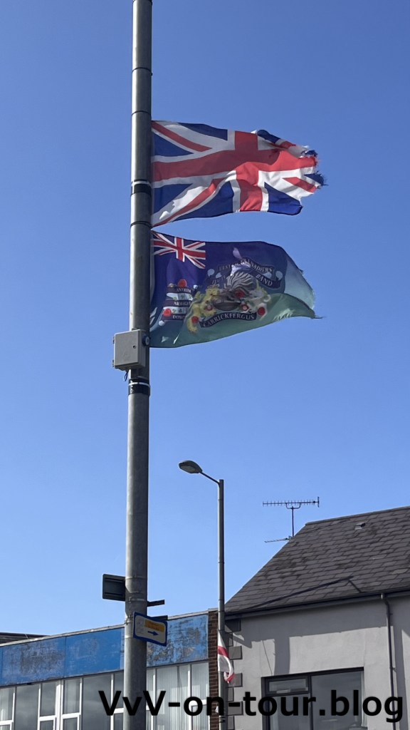 Wir sind raus aus der EU und haben das Vereinigte Königreich betreten. Davon merkt man zunächst nicht viel, da es keinerlei Grenze oder Grenzmarkierungen gibt. Allerdings weisen uns die vielen an den Lampenmasten aufgehängten Unions Jacks darauf hin, dass wir jetzt in einer anderen Welt sind. Nebenbei hat auch unser Navi automatisch von KM auf Meilen umgestellt.
