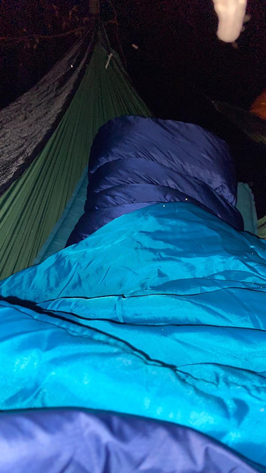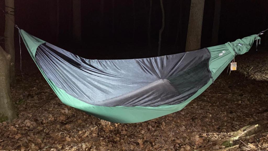 Der Aufbau der Hängematte war zu Hause noch mal per YouTube angeschaut worden. Ohne große Probleme hing die Matte. Gegen die Kälte von unten und für die Gemütlichkeit wird die Isomatte in die Hängematte gelegt und natürlich der warme Schlafsack.