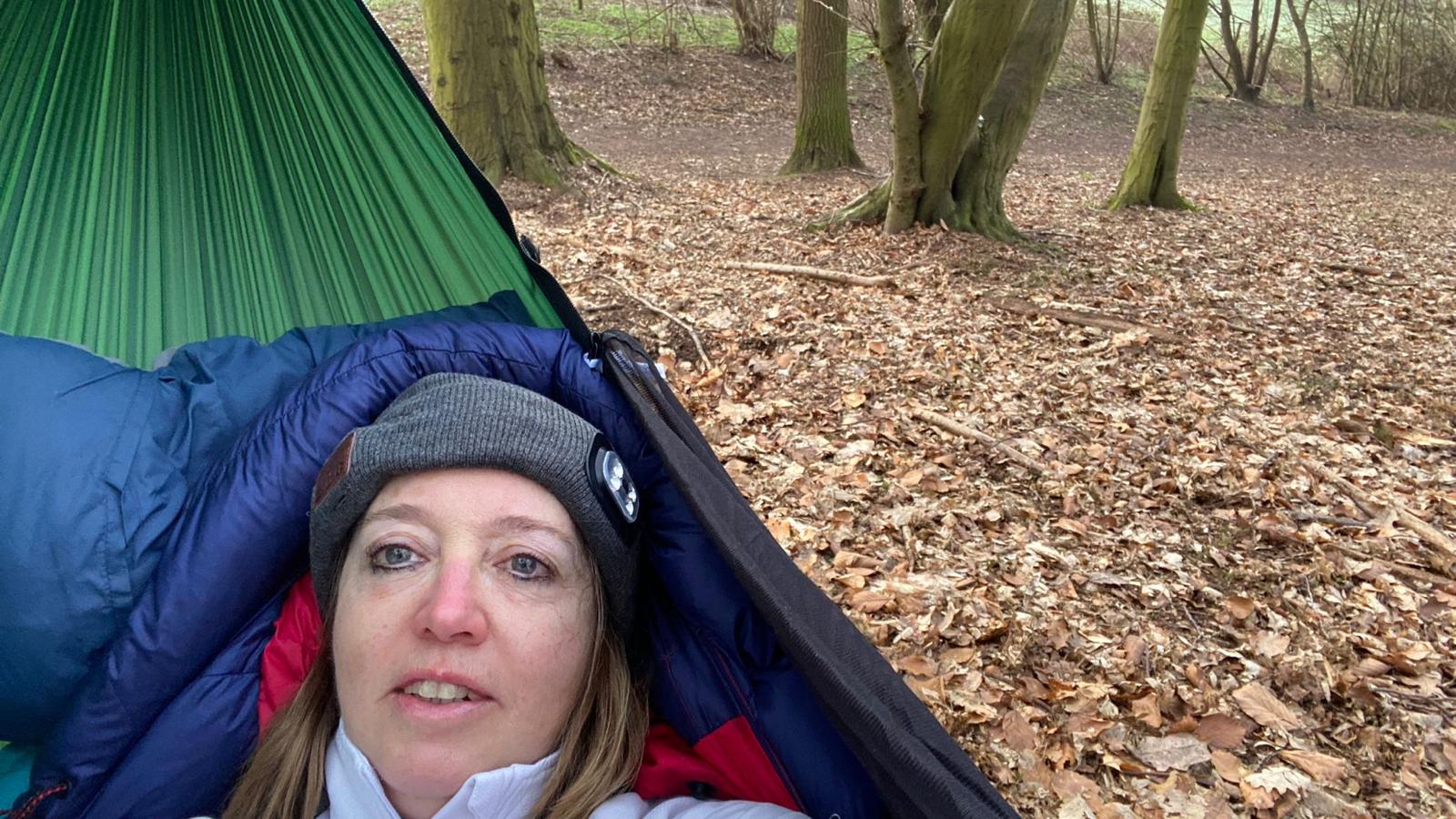 Zur Feier des (int. Frauen-) Tages startete der Abend mit einem leckeren Käsefondue und einer Flasche Sekt bevor die Rucksäcke mit der Ausrüstung geschultert wurden. Raus ging es in die kalte Nacht und in den dunklen Wald. Nach ca. 8 km Wanderung galt es, geeignete Bäume zu finden. So dick müssen die Bäume gar nicht sein. Wichtiger ist der geeignete Abstand. Siehe da, es wurde ein Plätzchen gefunden zum sich in den Kreis hängen. Ideal!