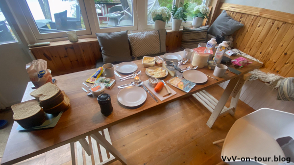 Pünktlich zum Frühstück zeigt sich die Sonne. Schnell die Terrassenmöbel getrocknet und schon kann draußen mit Seeblick gefrühstückt werden.