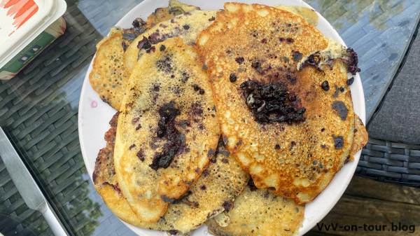 Blaubeer – Pancakes bereichern heute das Frühstücksbüfett. Sehr lecker und sehr schwedisch.