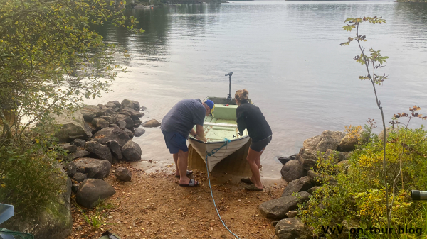 Der Wasserstand im Boot lässt darauf schließen, dass es wohl auch in den letzten Tagen ordentlich geregnet hat. Erstmal wird geschöpft. Wenn man schon bis über die Knie im Wasser steht – dann kann auch ein erfrischendes Bad im See genommen werden.