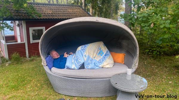 Oh, die Sonne scheint, aber es ist erheblich kühler geworden. Trotzdem wagen wir es und es wird auf der Terrasse gefrühstückt. Das Wetter lädt aber auch dazu ein, endlich mal die gemütlichen Terrassenmöbel auszunutzen. Diese schönen ovalen und überdachten „Betten“, die mit einer gemütlichen Matratze ausgestattet werden können. Ohne Decke geht es aber nicht.