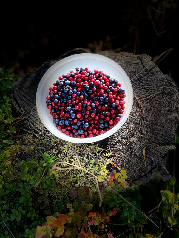 Gleich geht es noch mal zu den Blaubeeren. Es gab dort auch Preiselbeeren. Vielleicht kann noch etwas geerntet werden trotz des Regens gestern. Der Traum, hier direkt Marmelade zu kochen, ist noch nicht ausgeträumt. Mit einer vollen Schale gepflückter Beeren kommen wir zurück. Die Ernte entspricht einem guten Pfund Früchte. Morgen noch einmal der gleiche Erfolg und die Menge würde für leckere Blaubeeren / Preiselbeeren Marmelade reichen,