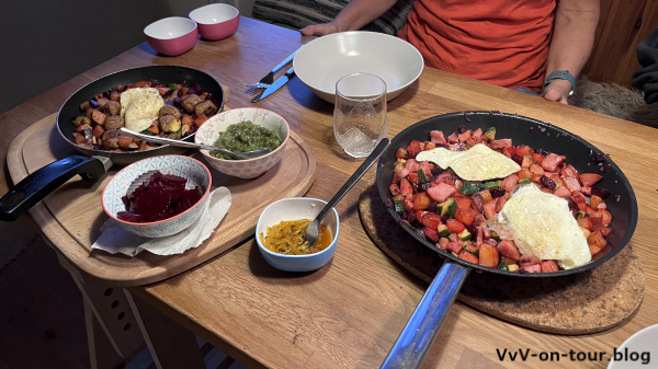 Zum Abendessen wird sich wieder unserem Gemüsevorräten gewidmet. Es gibt eine Zucchini /Rote Beete/Mangold Pfanne mit gerösteten Kartoffelwürfeln als Beilage. Die Kartoffeln wurden auch noch auf dem Feld gefunden.