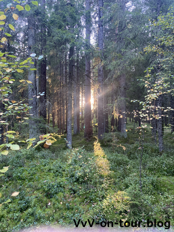 Am Nachmittag werden endlich Aktivitäten entfaltet. Es geht mir dem Boot wieder auf den See und wir Frauen gehen wandern. Die Gegend hier ist sehr schön und bei dem Wetter sowieso. Überall verstecken sich schöne Seen und auch die beginnende Herbststimmung ist sehr reizvoll. Die Pilze erstrahlen in der Sonne in den schönsten Farben. Die Sonnenstrahlen finden ihren Weg zwischen den Baumstämmen und lassen das Moos leuchten. Die goldenen Bäume spiegeln sich in den Seen – eine traumhafte Landschaft.