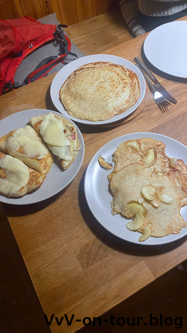 Zum Abendbrot gibt es Pfannkuchen. Die Äpfel haben wir in der Nachbarschaft aufgesammelt.